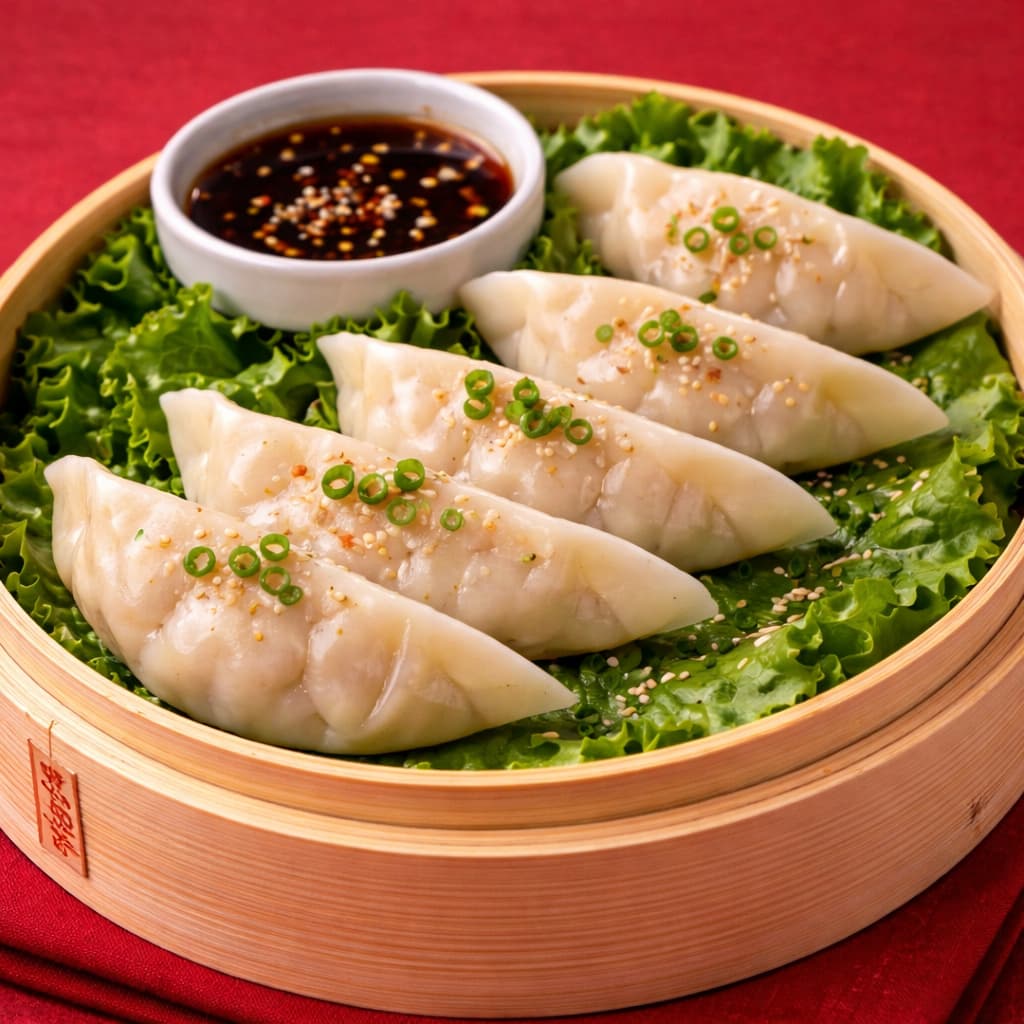 Dumplings al vapor con mezcla de chancho y langostino, suaves y con un sabor intenso y equilibrado.